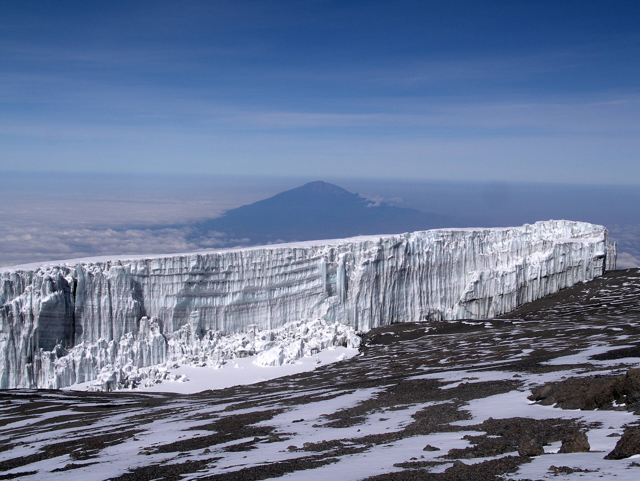 Die Luft wird merklich dünner, die Temperaturen tiefer, im obersten Teil ist etwas Kraxelei nötig - trotzdem sind die 5 km auf den Gipfel in rund 6 h zu schaffen. Die phänomenale Sicht bei Sonnenaufgang auf den fernen Kilimanjaro entschädigt für alle Mühen und die weiteren 5 h oder rund 2000 HM, zuerst entlang des Kraterrandes und dann hinunter zur Miriakamba Hut, fallen uns relativ leicht.