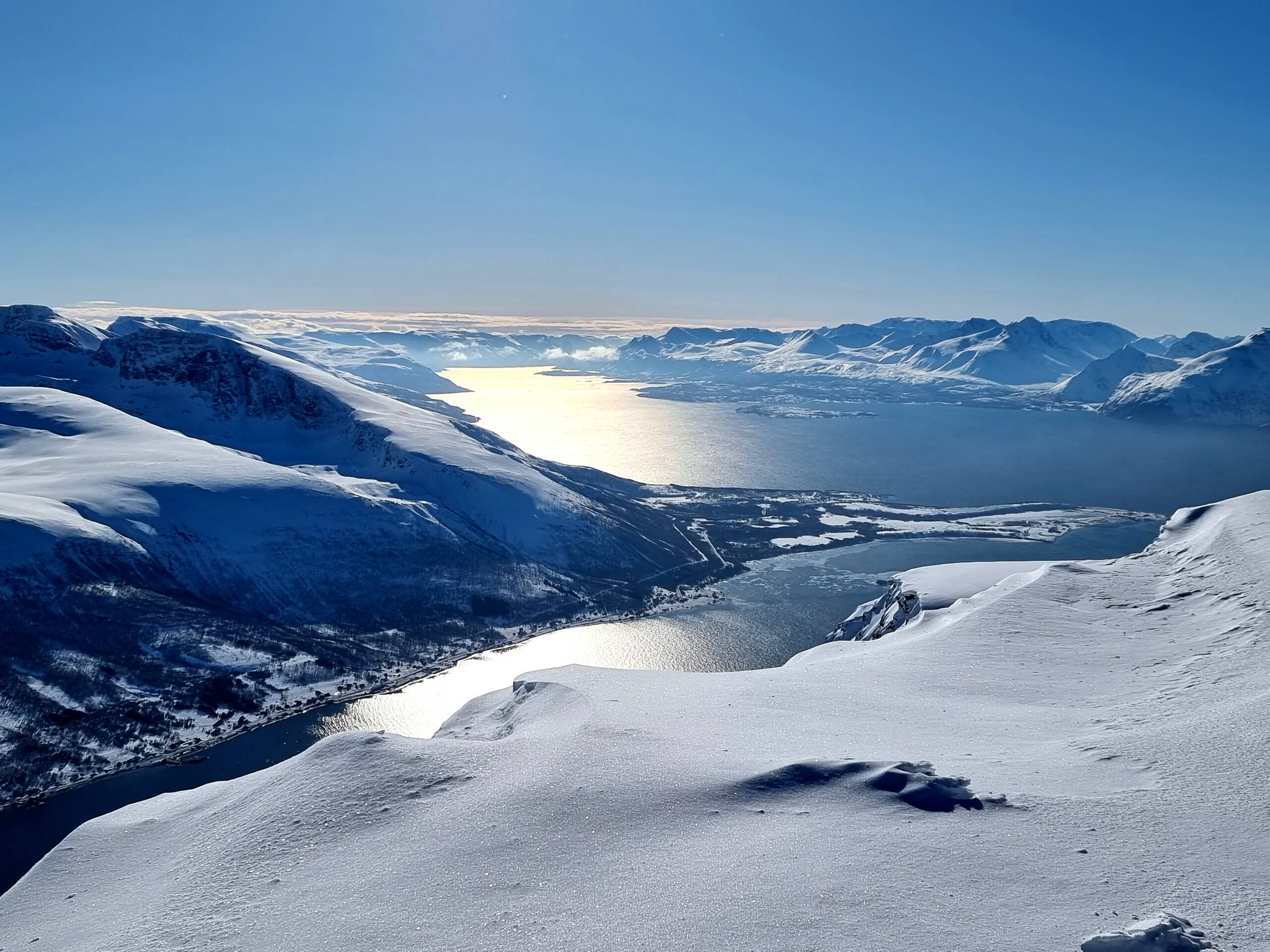 Die Sicht von den 1000 – 1300 m hohen Gipfeln im Gebiet der Lyngenalps auf die verschneiten Berge der Inseln in den tiefblauen Fjorden ist einfach überwältigend!