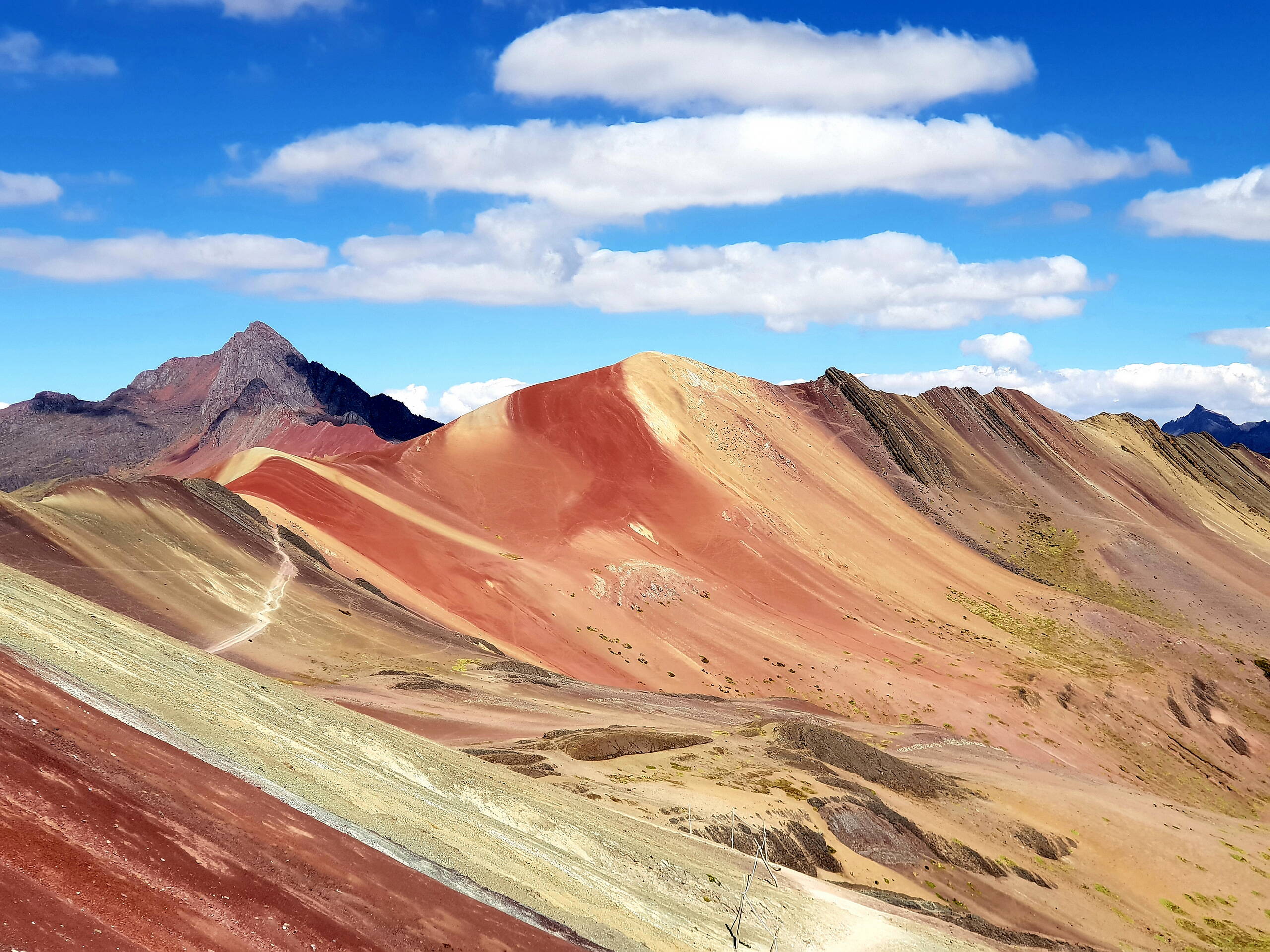 ...Peru. Bis zu sieben verschiedene Farben verlaufen parallel zueinander wie ein Regenbogen. Die bunte Färbung ist vor Millionen von Jahren durch Mineralien in überlagerten Sedimentschichten entstanden, die durch die Plattentektonik nach oben gedrückt wurden. Dabei hat Eisenoxid zur rötlichen Färbung geführt, Magnesium zu den helleren Pinktönen, und eine Reaktion von Kupfer mit Wasser und Sauerstoff zur blaugrünen Verfärbung. Es gibt zwei Regionen, in denen man dieses Naturschauspiel erleben kann. Dazu muss man jeweils eine längere Anfahrt, sowie eine ca 3 h -Wanderung bis auf eine Höhe von mehr als 5000 m in Kauf nehmen.